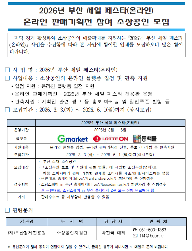 86 [한국중소벤처기업유통원] 2026년 부산 세일 페스타 온라인 판매기획전 참여 소상공인 모집 icon 관리자 2026-03-06 6