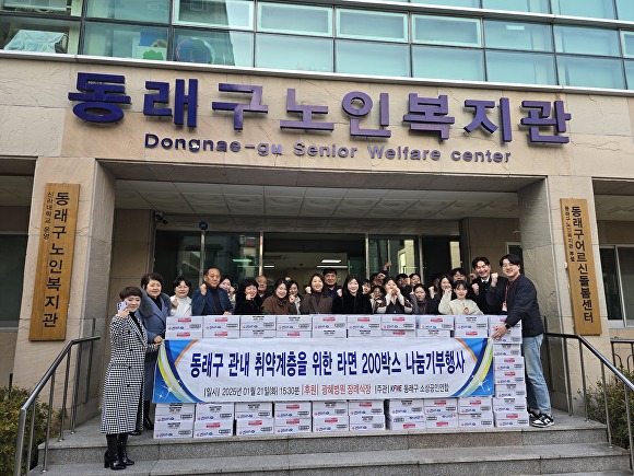 부산광역시 동래구 소상공인연합회가 광혜병원 장례식장과 함께 지난 1월 21일 동래구 노인복지관에서 '동래구 관내 취약계층을 위한 라면 200박스 나눔기부행사'를 개최하였다.
